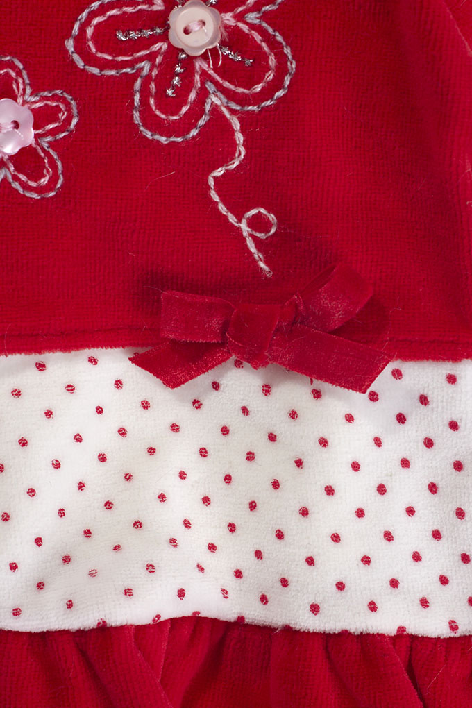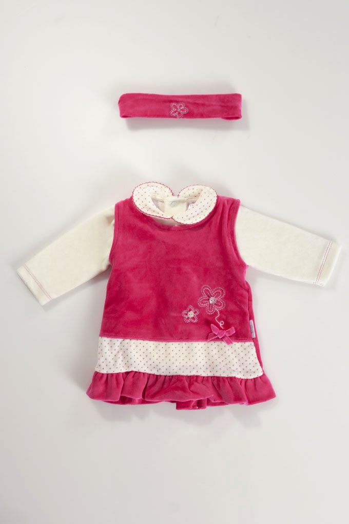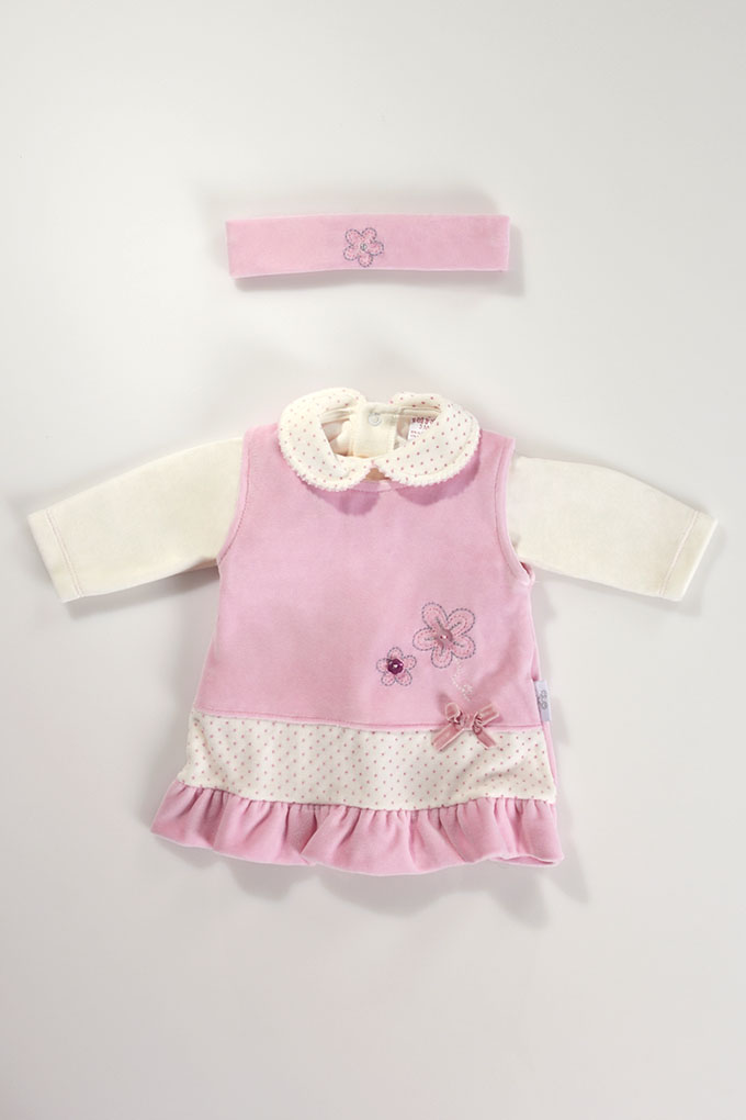 Vestido para bebé laminado com aplicações bordadas 1-dó-li-tá®. Artigo da colecção Primavera/Verão. Disponível em sortido de cores com apresentação em caixa.
