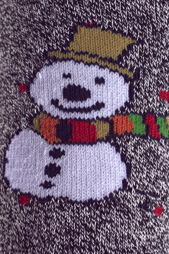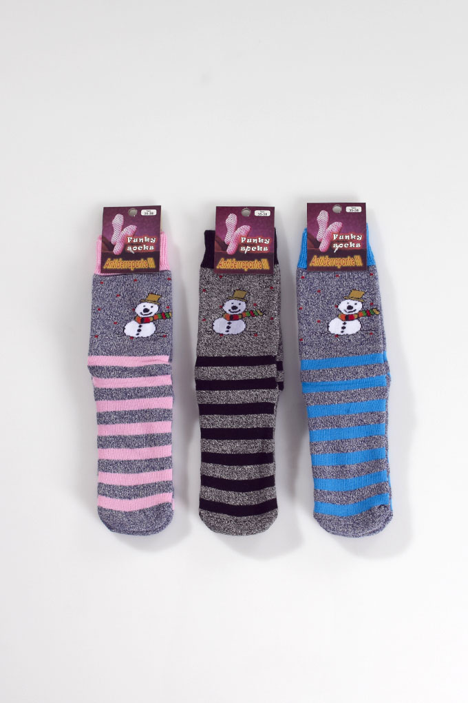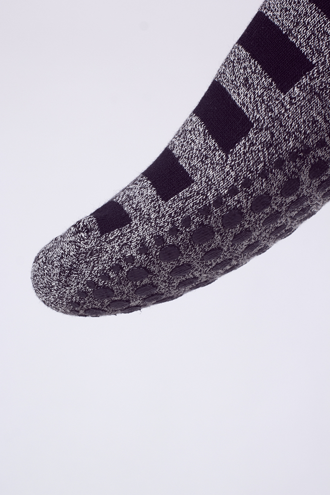 Peúga estampada para adulto com sola antiderrapante. Disponível em riscado de três cores sob fundo cinzento.