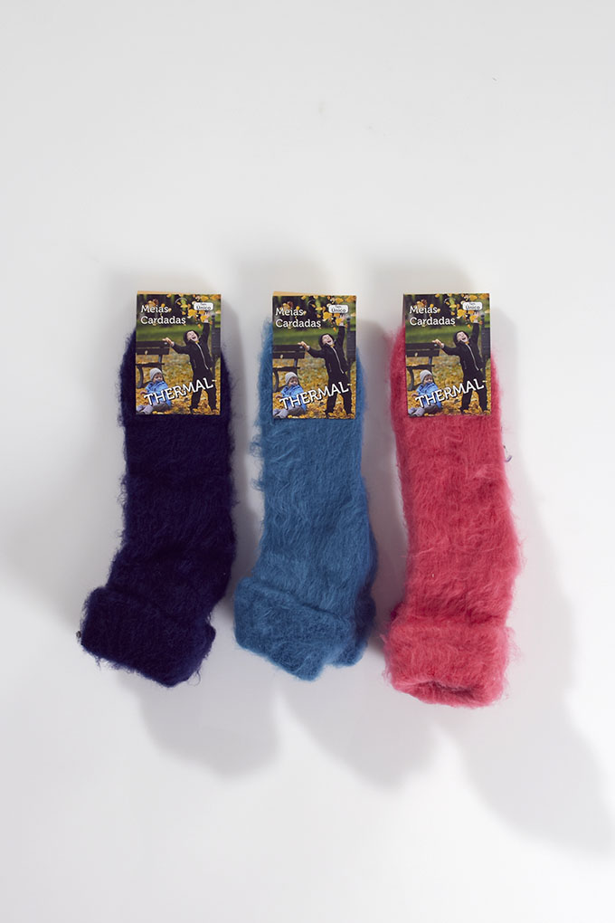 Peúga alta para senhora com carda exterior. Disponível em sortido de três cores por dúzia.